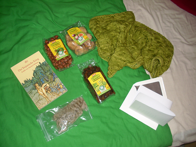 Dazu habe ich dann noch ein paar Trockenfrüchte aus der Türkei gepackt, die in der Nähe von Troja gewachsen sein sollten, und ein Buch über den Trojanischen Krieg. Und ein bisschen Haar des Zwerges aus Schneeweißchen und Rosenrot war auch mit auf die Reise gegangen. Allerdings kann ich nun wirklich nicht mehr sagen, was das nun für Wolle ist.