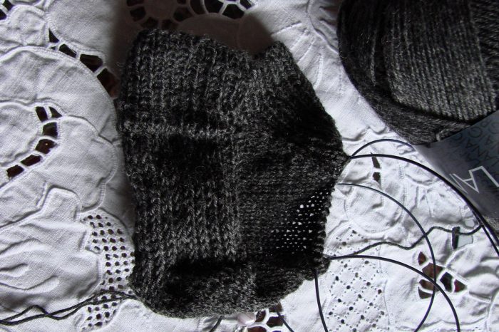 Mein Mann hat nicht mehr gesagt, dass er keine Socken haben mag, also hab ich mal schnell zwei Knäul in gedeckten Farben gekauft. Ja, trotz meines guten Vorrates habe ich keine Wolle in Männerfarben. Was soll’s, nun hab ich welche und habe dann am Sonntag direkt angeschlagen. Uno Socks von Sharon Ladyman stricken sich relativ schnell, wenn man den Anfang mit den verkürzten Reihen verstanden hat. Somit wird allerdings auch der Schaft oberhalb der Ferse etwas höher und ich denke auch angenehm zu tragen. Da ich allerdings recht selten Socken stricke habe ich mich natürlich mit der Länge des Fußes vertan und bin nun am zweiten Ribbeln. Aber somit sollte der erste Sneakers heute Abend fertig sein.