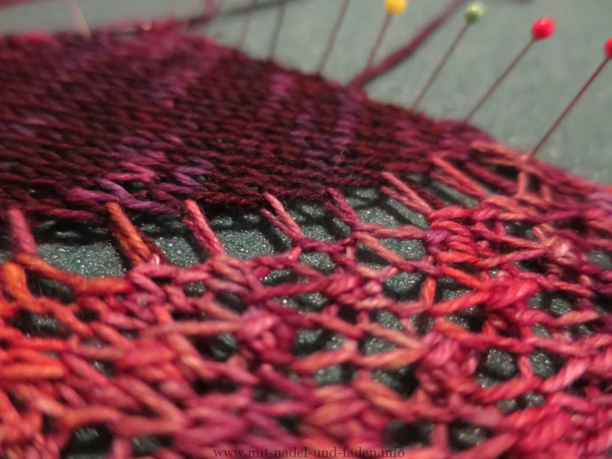 Nun ist es schon wieder Sonntag Abend und Zeit für mich, ein Resümee zu ziehen. Ich sags mal so, ich habe ein bisschen gestrickt und der Anfang ist getan. Aber dann kam da noch ein anderer Teststrick dazwischen, wo ich einfach in die Wolle verliebt bin. Aber ich Grunde bin ich auch so zufrieden. Die Woche war arg turbulent abseits des Strickens, so dass mir nicht wirklich viel Zeit dazu geblieben ist. Ich denke mal, sobald ich das andere Tuch fertig habe, werde ich mit diesem hier auch nicht lange brauchen. Ich muss nur bei den Farbübergängen etwas aufpassen, aber es macht Spaß, ein Tuch mal anders zu stricken. Verkürzte Reihen habe ich zwar schon öfters gestrickt, aber dabei einen Farbwechsel einzubauen und die Wendemaschen hervorzuheben ist neu für mich und hat auch seinen Reiz.