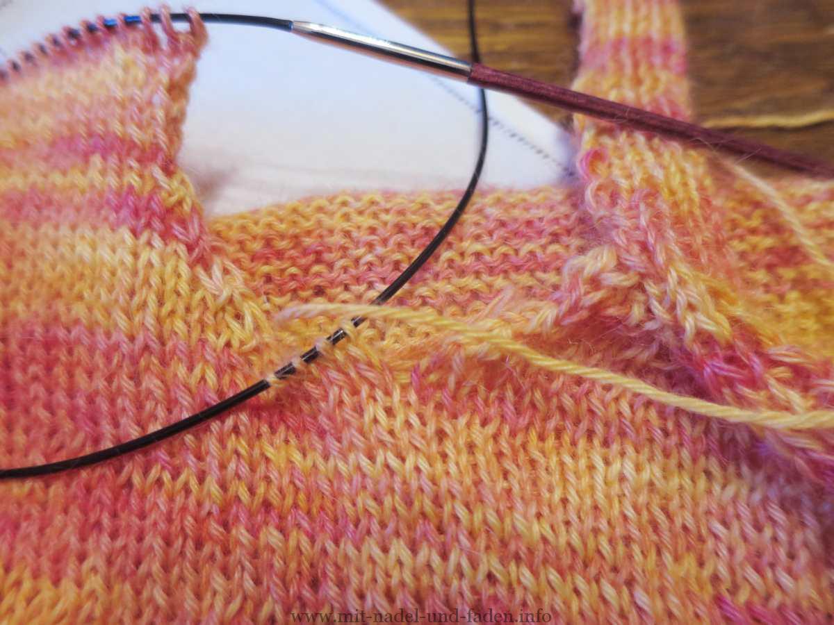 Zwei Wermutstropfen gab es jedoch diese Woche. Beim Anstrick des neuen Knäuls habe ich mich arg geärgert, aber es ist nun einmal handgefärbt. Die Farben sind zwar identisch, aber die Gewichtung der Farben ist beim zweiten Knäule eher Richtung gelb zu finden. Im Gegensatz zum ersten Strang, der mehr ins rötliche tendiert. Auch die gefärbten Abschnitte auf den Strängen sind unterschiedlich, so dass ich nun im oberen Bereich des Pullis eher eine Streifenbildung habe. Ich bin mir zu Beginn sehr sicher gewesen, dass ich das so nicht mag. Mittlerweile sehe ich das nicht mehr so kritisch. Aber ganz klar ist mir das trotzdem noch nicht. Und es ist ein weiterer Punkt, mich von handgefärbter Wolle zu verabschieden. Solche unregelmäßige Färbungen bei gleicher Partie mag ich einfach nicht verarbeiten.