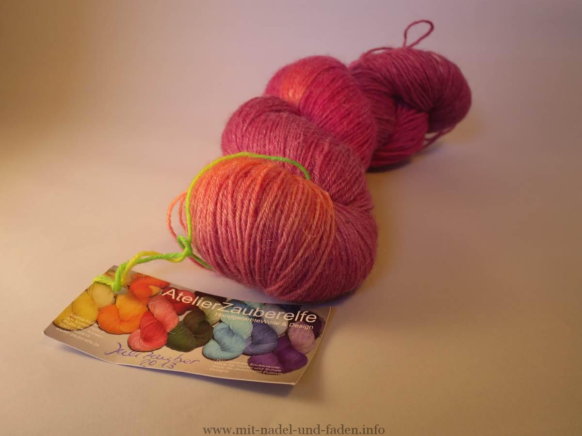 Der Winter naht. So heißt es im Lied von Feuer und Eis, was ich derzeit brav am Hören bin. Dabei strickt sich so ein Schal natürlich besonders gut. Mama hat sich letztens eine wunderschöne graue Winterjacke gekauft. Dazu fehlt natürlich der passende Schal. Nach kurzer Inspektion meines Wollvorrates fiel ihr Julizauber 2013 von Atelier Zauberelfe in die Hände. Eine Sockenwolle auf Bambus/Seidenbasis.